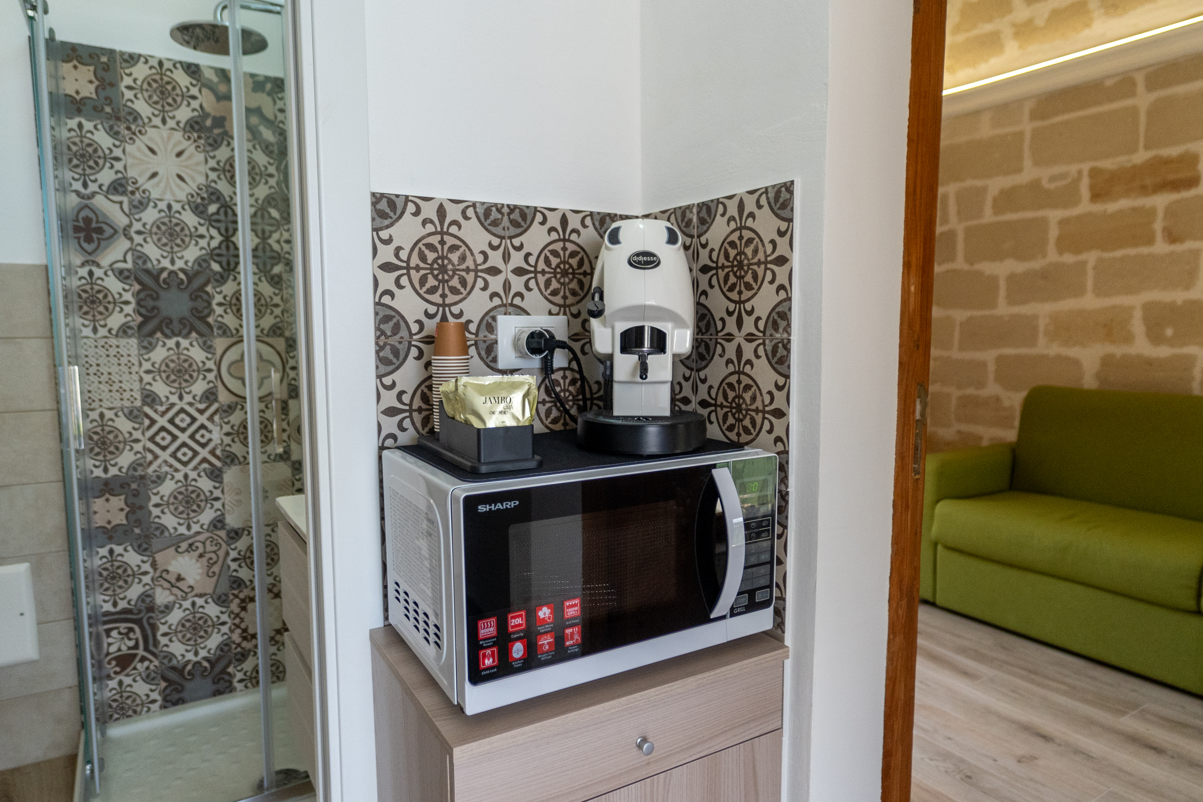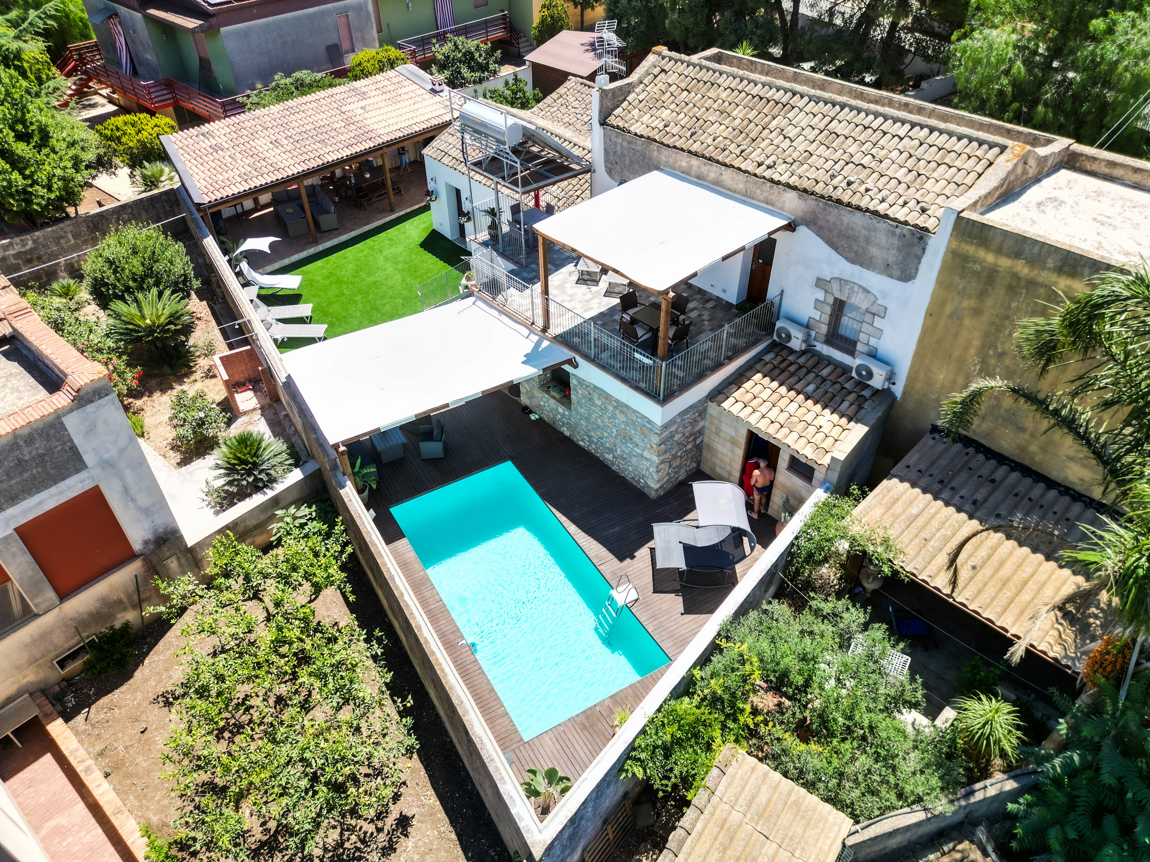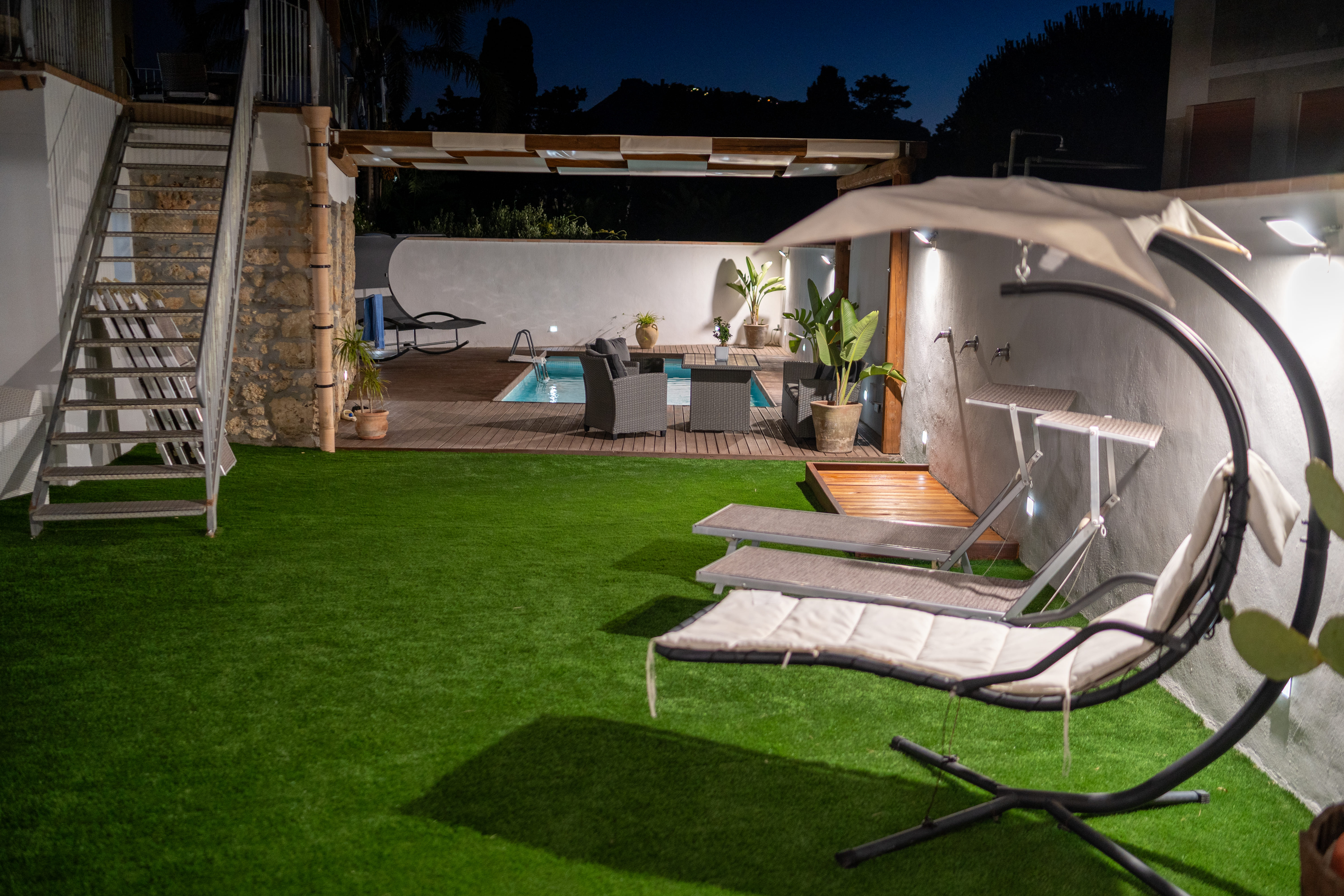 - Lo spazio piscina è corredato da un bagno-spogliatoio con doccia e zona lavanderia. Inoltre nella zona adiacente la piscina sono presenti tre docce prospicienti un meraviglioso prato verde, ove è possibile rilassarsi e abbronzarsi con il meraviglioso sole isolano!