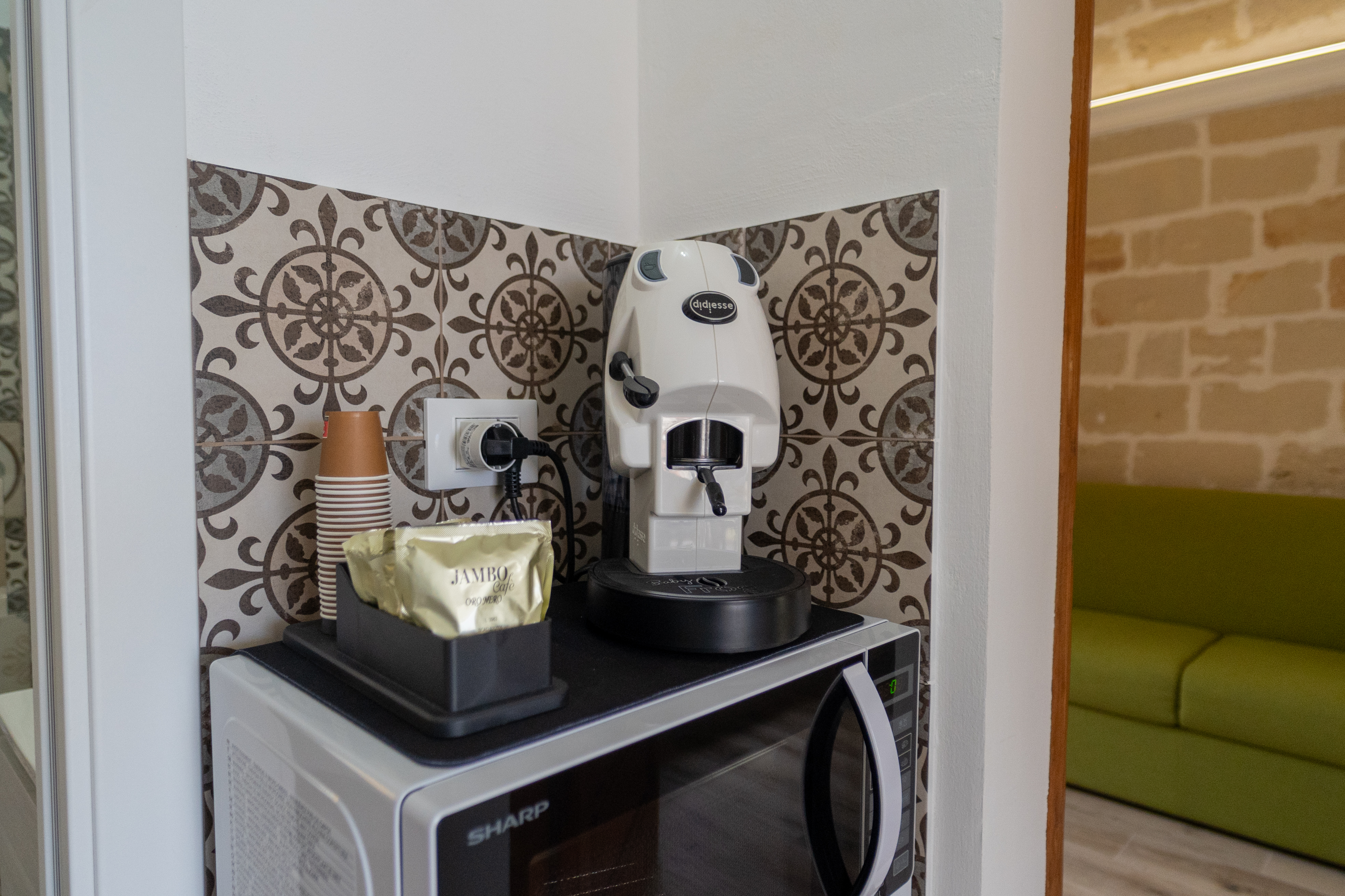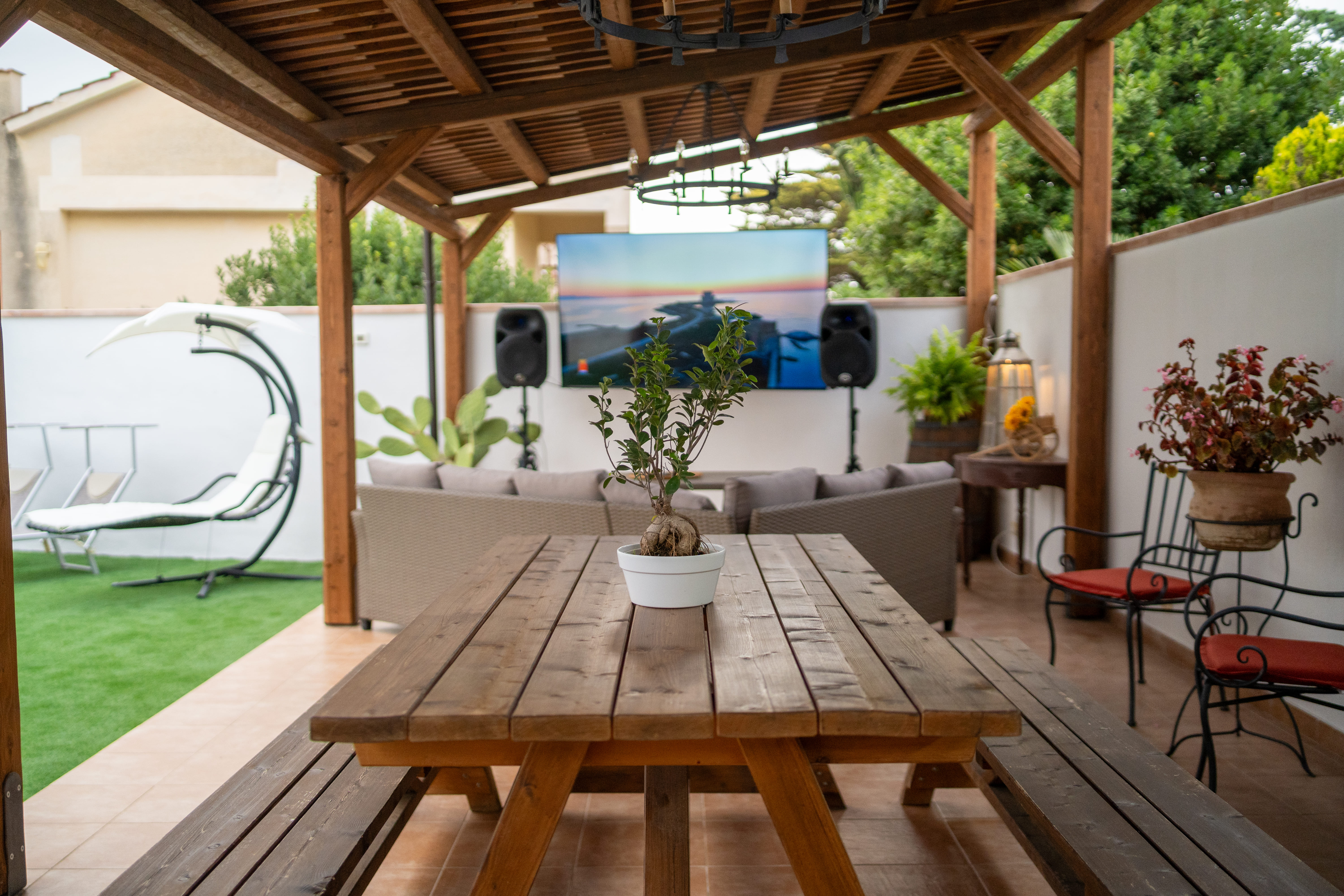 - L'ampia veranda confinante con il prato verde, è dotata un area relax composta da delle comode poltrone e un televisore di ben 85 pollici, nonchè di un doppio barbecue con cui sarà possibile gustare le prelibatezze che la nostra amata terra ci offre!