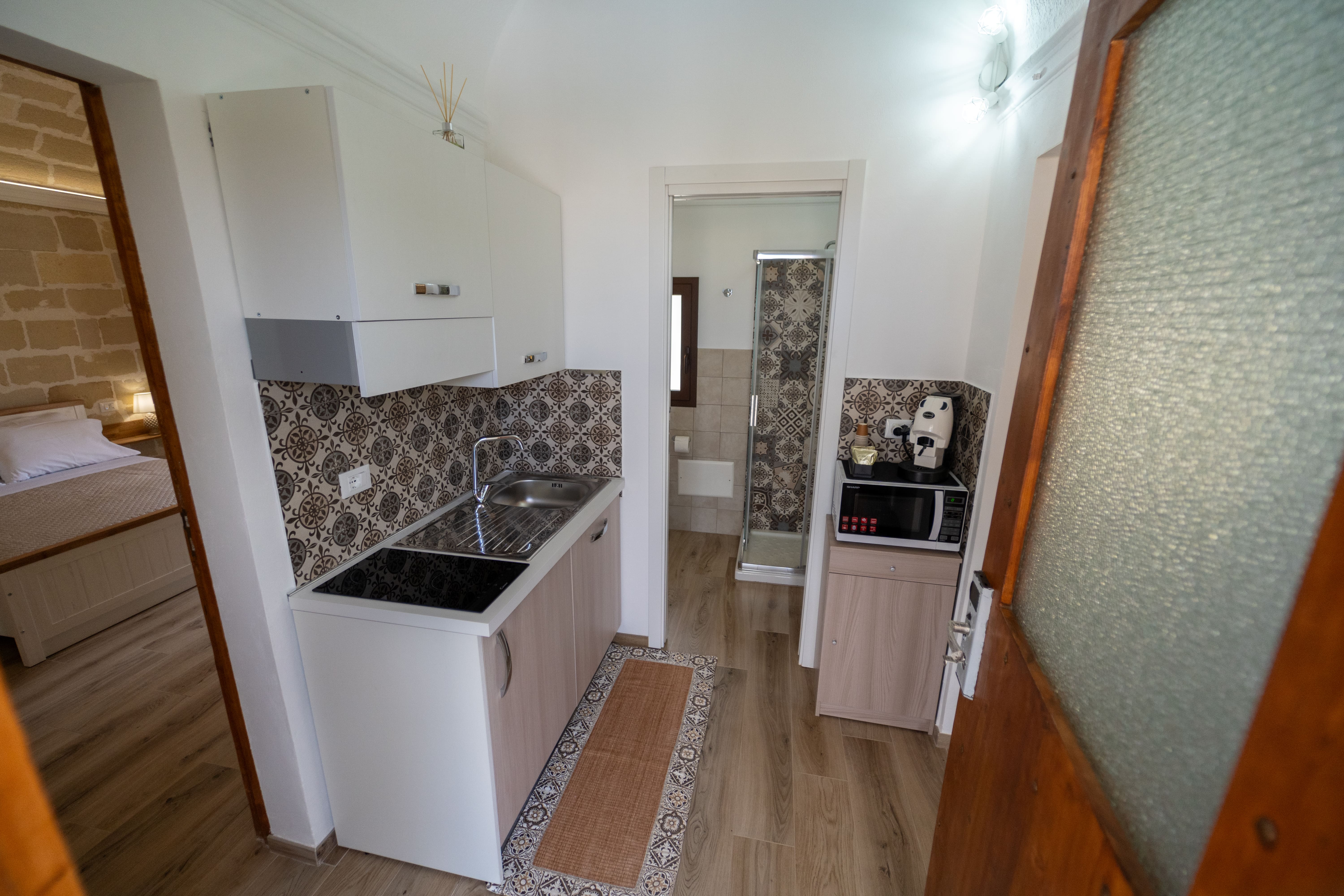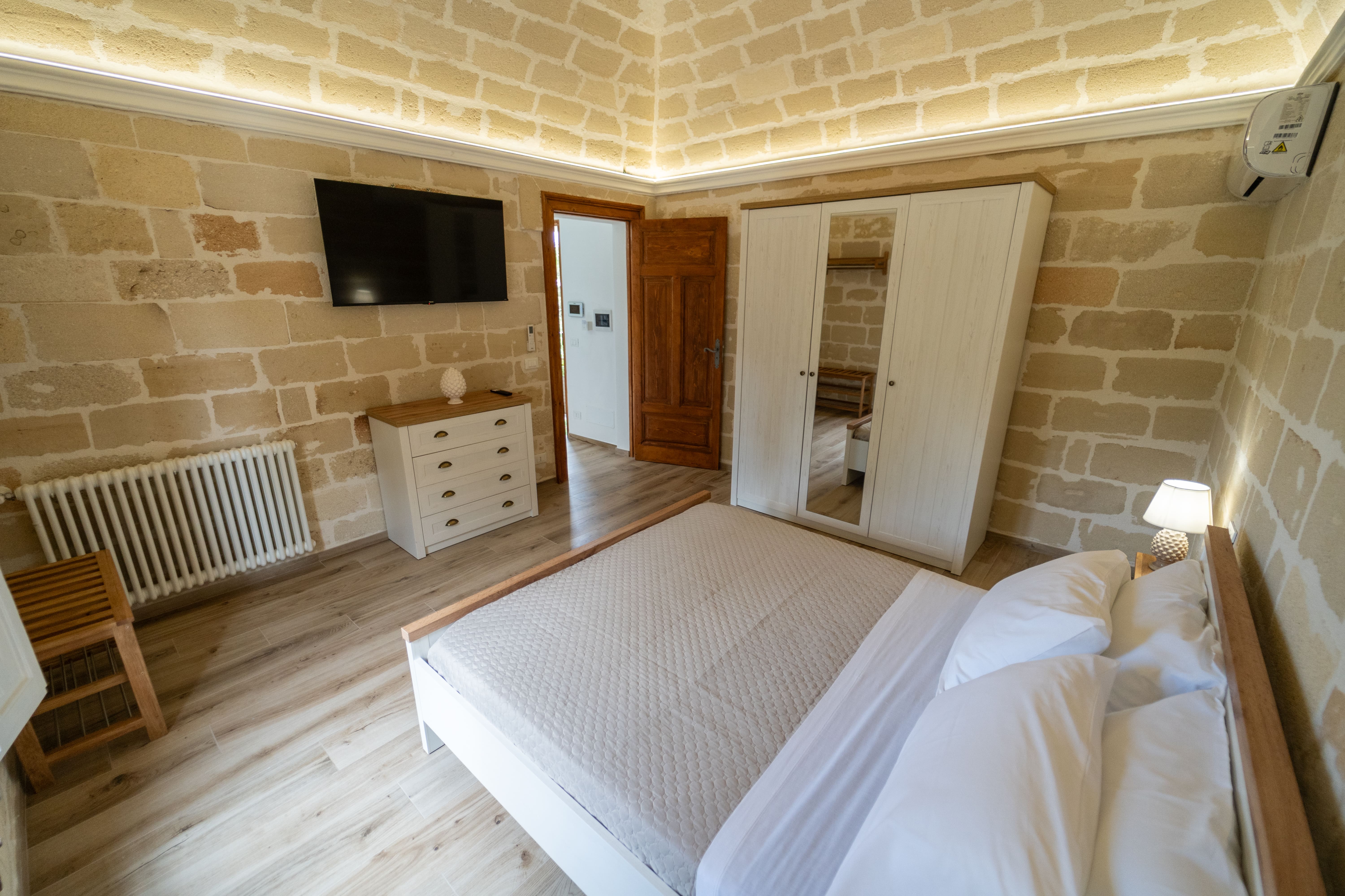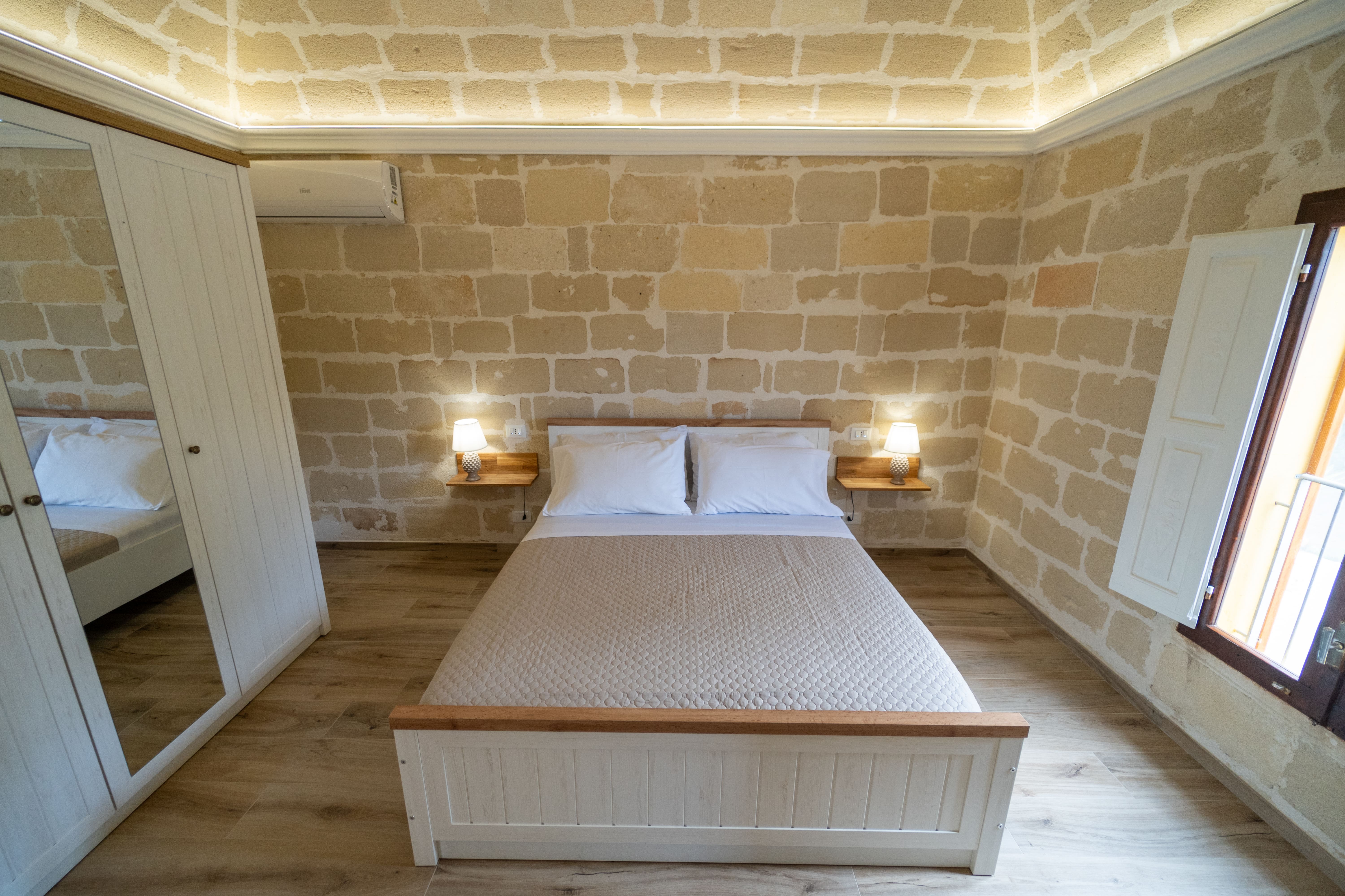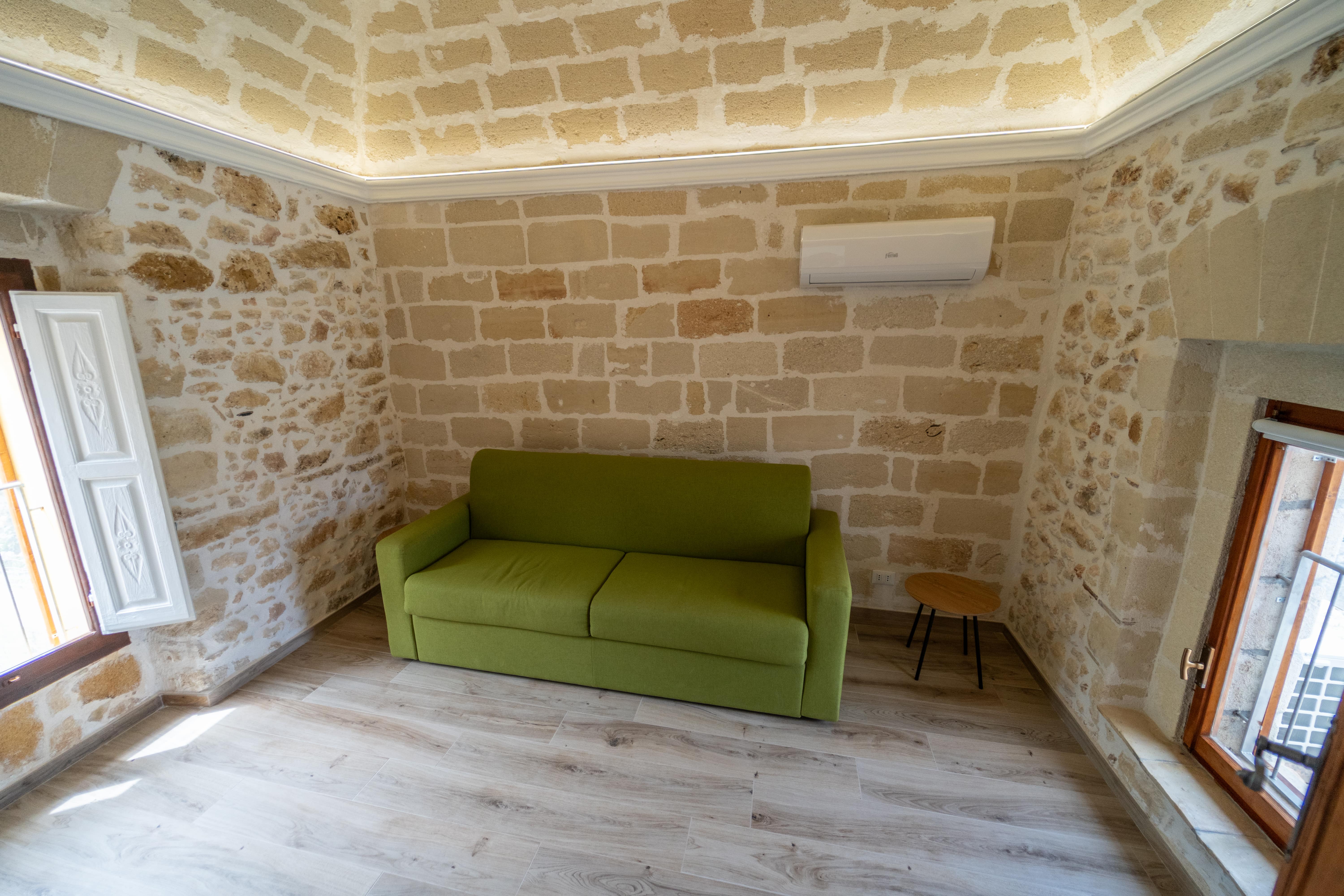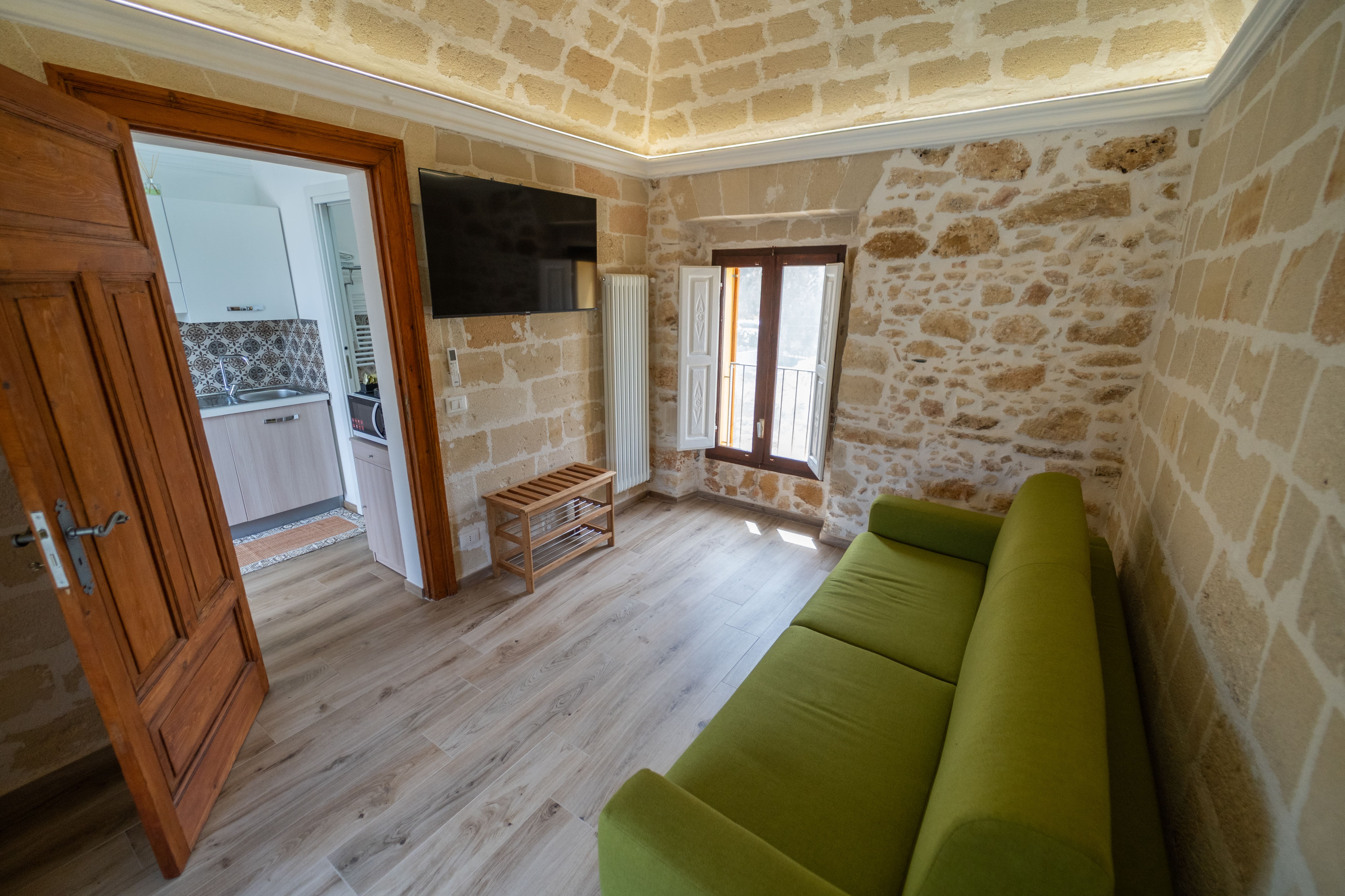 L'appartamento "Le Volte" si presenta interamente ristrutturato e prende il nome dal tetto dell'abitazione fatto con le "volte antiche" di cui è dotato. Spogliato dai vecchi intonaci si è riscoperto un affascinante ambiente rustico con tufi risalenti all'epoca passata. L'ambiente è fornito di un ampia camera da letto rustico-moderna, una seconda camera con divano letto, un angolo cucina attrezzato con tutti gli elettrodomestici necessari e da un bagno con doccia. L'affitto comprende una grande veranda annessa, parzialmente coperta da un gazebo in legno massello con affaccio alla piscina. La veranda è altresì dotata di un divano a tre posti, due poltrone e un tavolo per le serate romantiche. I tre grandi spazi esterni sono fruibili da tutti gli ospiti della struttura.